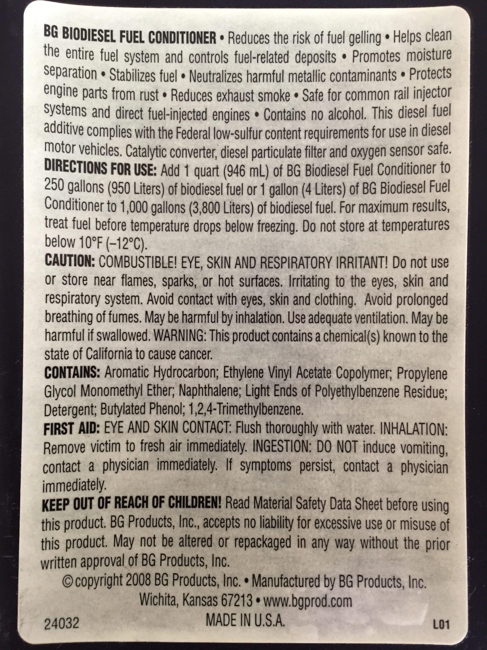 BG products, opgericht in 1971 USA, produceert onderhoudsproducten en reinigingssystemen voor benzine- en dieselmotoren. Denk hierbij aan toevoegingen voor olie en brandstof die de levensduur en het brandstofverbruik van de motor verbeteren. Voorkomt veroudering en bacterieen in de brandstof! Gebruik het preventief!